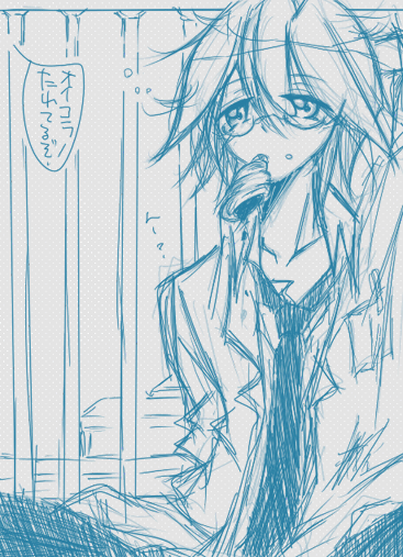 さく丸的高校生ファイ妄想↓ ・ヨレヨレに着た制服 ・薬品まみれのダボダボな白衣 ・チョココロネが好き (チョココロネなんです。見えなくてもチョココロネなんです) ・びょんびょん跳ねた髪 ・眼鏡 高校生パラレル本を執筆中に、逃避で描いたものです。 うちのファイはこんな感じでした。 今見ると電波にも程がありますね…(笑) <08.0701>